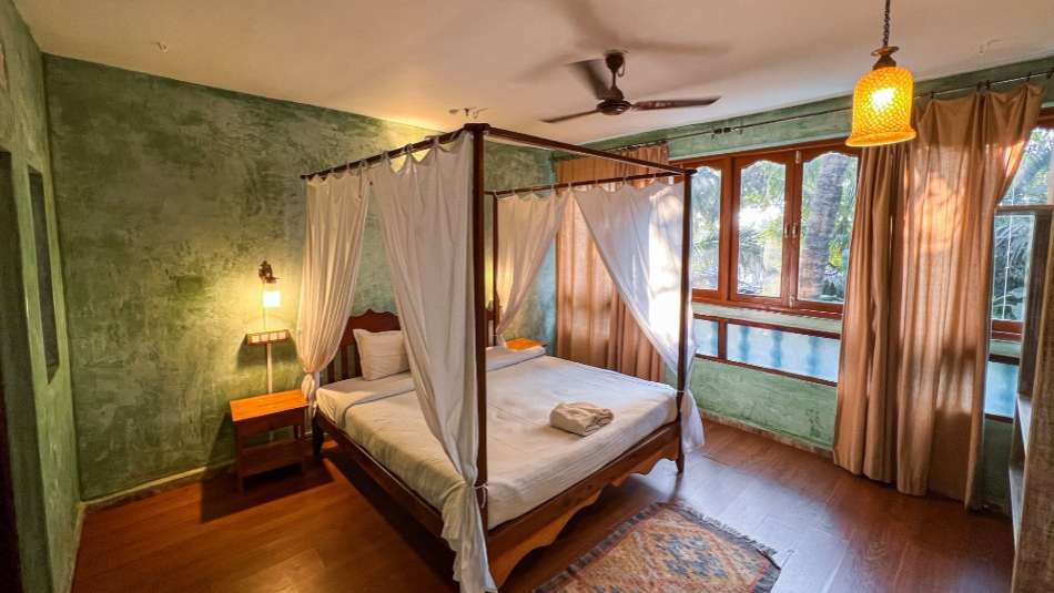 Our Beachside Heritage Rooms offer a perfect blend of comfort and tradition, featuring heritage-inspired elements, spacious layouts, and elegant decor. Nestled near the shore amidst lush tropical greenery and swaying palm trees, these rooms provide a serene escape at Nalanda Retreat. Each room boasts a private balcony, comfortable bed, private bathroom, storage cupboard, fan, and air conditioning. These rooms are equipped with 1 double bed and 1 sofa bed, ideal for families or small groups.