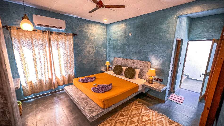 Nestled along the banks of the Mandrem River, surrounded by swaying palms and just 200 meters from the golden sands of Mandrem Beach, our Hillside Heritage Rooms offer a tranquil retreat in nature’s embrace. These rooms are adorned with vibrant Indian colors and intricate craftsmanship, reflecting the rich traditions of Rajasthan. Guests can enjoy a world of comfort, class, and luxury, with warm interiors featuring elegant carpentry and luxurious fabrics. Each suite includes a private bathtub, an ensuite bathroom, and a cozy outdoor seating area with views of either the garden or pool, perfect for a relaxing escape.
